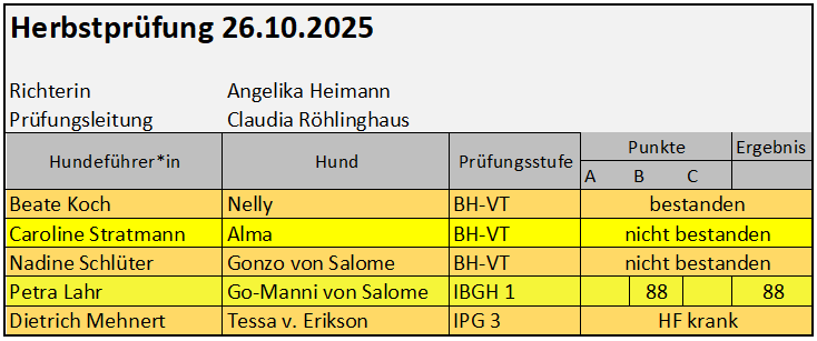 Die Vorzeichen für unsere Prüfungen standen nicht sehr gut. Wir veranstalteten die kleinste Prüfung seit vielen Jahren und auch das Wetter war nicht auf unserer Seite. Bei starken Sturmböen und anhaltendem Regen konnten dennoch zwei Prüfungsteams den Tag erfolgreich beenden. Die anderen beiden Begleithunde konnten leider bei den widrigen Wetterverhältnissen am Prüfungstag nicht ihre Bestform zeigen. Zur Siegerehrung war es dann plötzlich trocken.