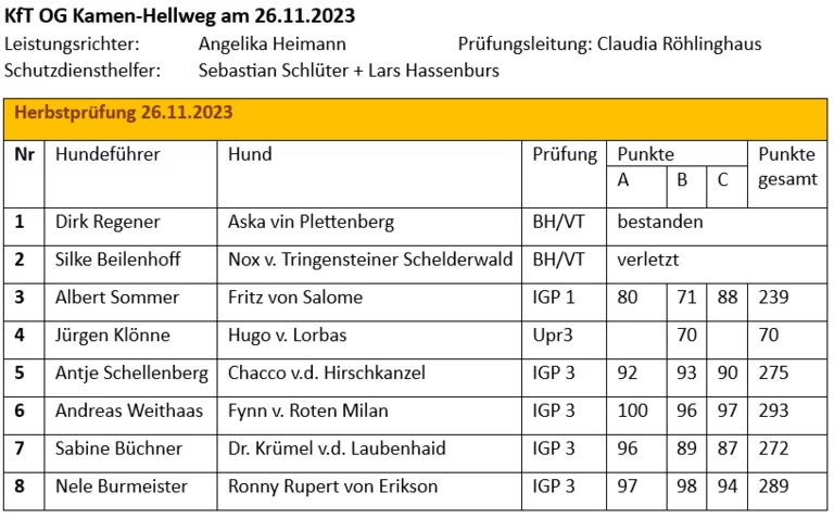 Ein kleiner Nachtrag Bei der DVG Prüfung in Lingen trat Antje Schellenberg mit ihrem Chacco von der Hirschkanzel an. Sie erzielte mit 97/88/93 in der IGP 3 Prüfung ein bemerkenswertes Ergebnis und belegte den 3. Rang des Gesamtfeldes. Wir gratulieren ihr recht herzlich. Helmut Lewandowski |